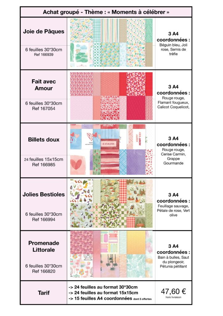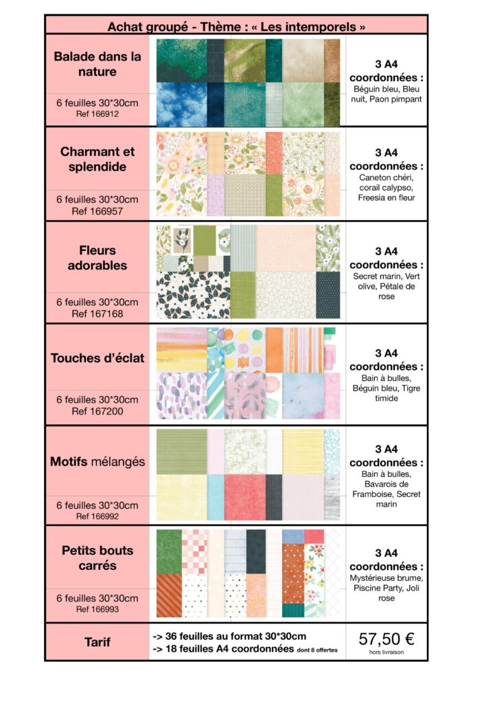 L’occasion parfaite de découvrir tous les nouveaux papiers à motifs et leurs A4 coordonnés, à petit prix, grâce à un partage équitable des lots complets.