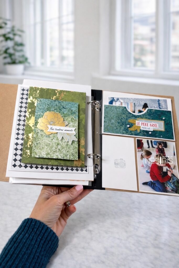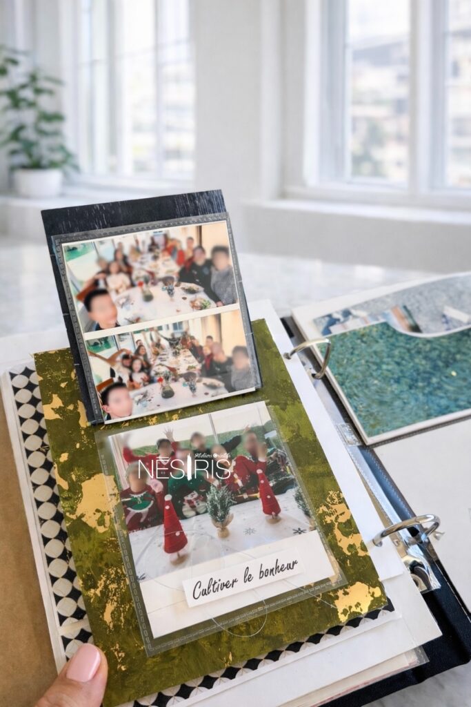 Chaque jeudi soir, je vous retrouve en live pour partager un projet créatif. Cette semaine, j’ai proposé un DIY « Deux pages scrap » pour la page de Décembre de notre album scrap 2025.