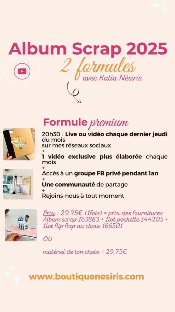 → Replay et tout le contenu est disponible🎁 Pour rejoindre le groupe PREMIUM, il suffit d’acquérir un petit kit de base avec les fournitures nécessaires à l’album : Album scrap (ref163883) + 1lot de pochettes (ref 144205) + 1lot de pochettes flip flap (ref 166501 ou taille de ton choix).