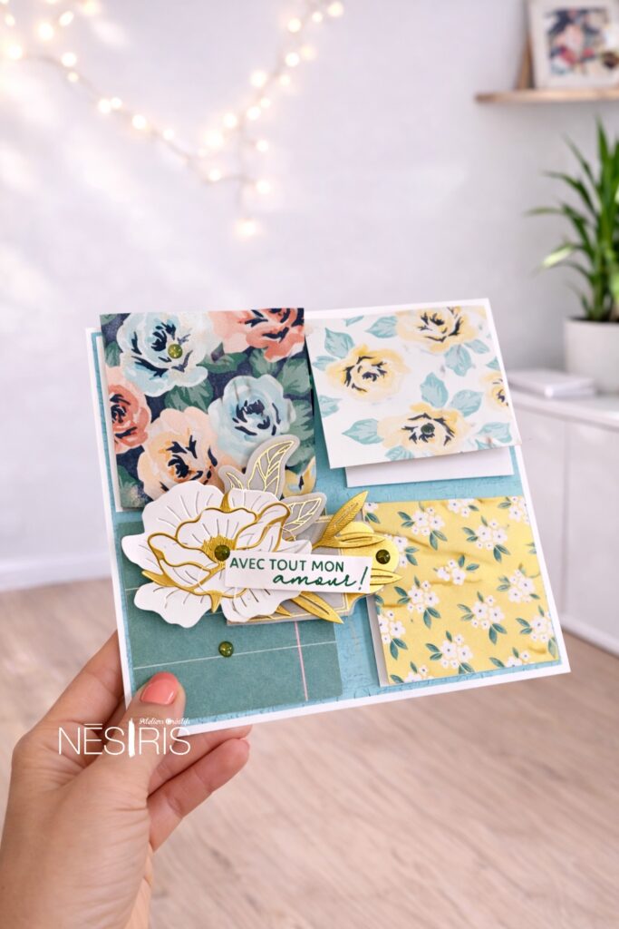 Tu cherches une idée de carte scrapbooking originale, facile à réaliser et qui fait vraiment son effet ? Cette carte à quatre rabats est parfaite pour toutes les occasions : anniversaire, fête, remerciement ou simplement pour faire plaisir 💛 Et tu peux même ajouter des photos 😉