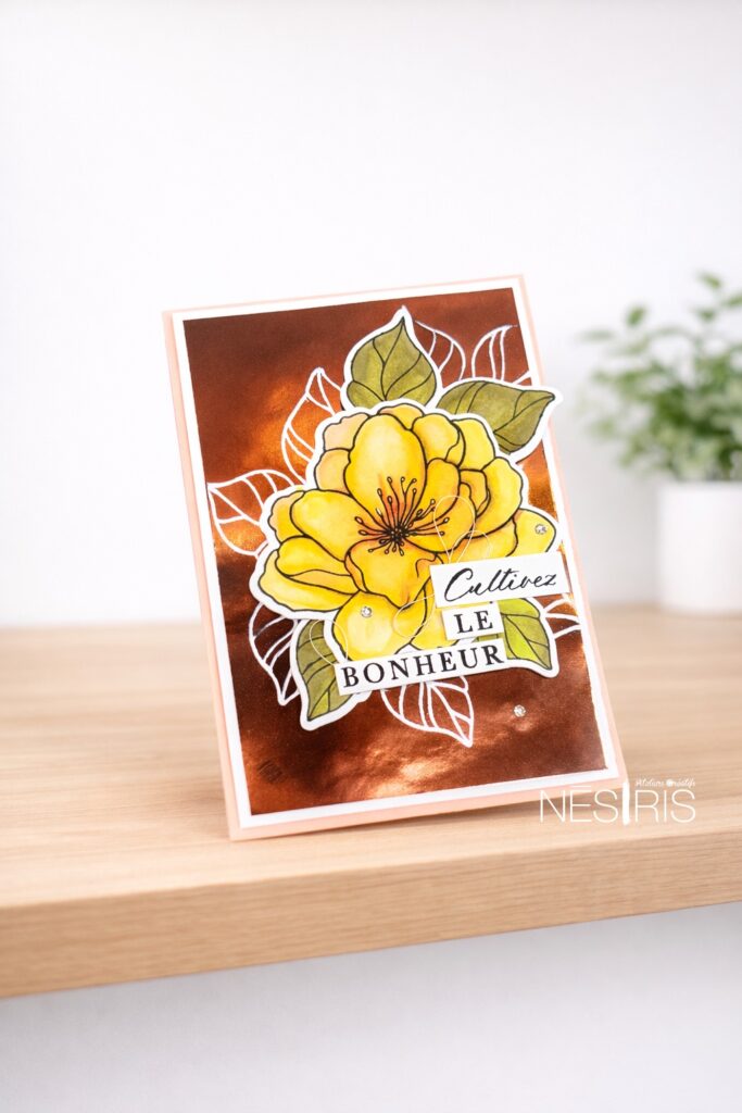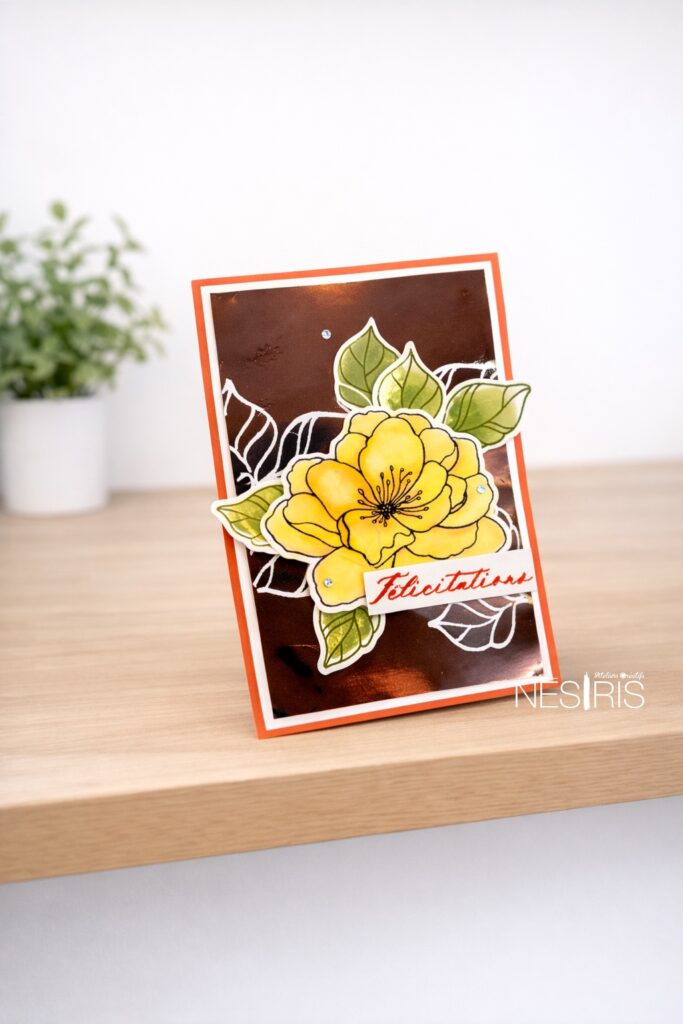 Aujourd’hui, je te propose de créer une carte lumineuse et de sortir tes poudres à embosser pour pleinement t’amuser avec l’embossage à chaud.